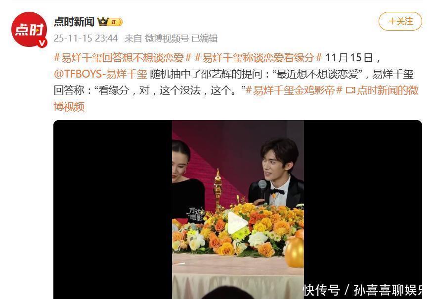 这短短几秒的反应,却被网友精准捕捉并疯狂转发。有人调侃“这白眼翻出了我等打工人的心声”,也有人称赞其“高情商化解尴尬”。一句“看缘分”,既未直接否认恋爱的可能性,又巧妙避开了过度曝光隐私,被不少网友封为“教科书式应答”。随后,邵艺辉导演主动抛出橄榄枝,笑称“非常希望千玺在我电影里谈恋爱”,易烊千玺也顺势接话“可以在电影里谈”,轻松将私人话题转向专业合作,再度展现机智。不过,这一提问也引发部分观众质疑:在电影颁奖礼的专业场合,追问演员私人感情是否恰当?尤其易烊千玺刚获影帝,正处于事业上升期,此类问题容易引发不必要的焦点偏移。多数粉丝对此表示“尊重隐私,关注作品”,也有人分析其回应中隐含“专注事业”的信号。